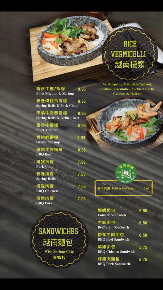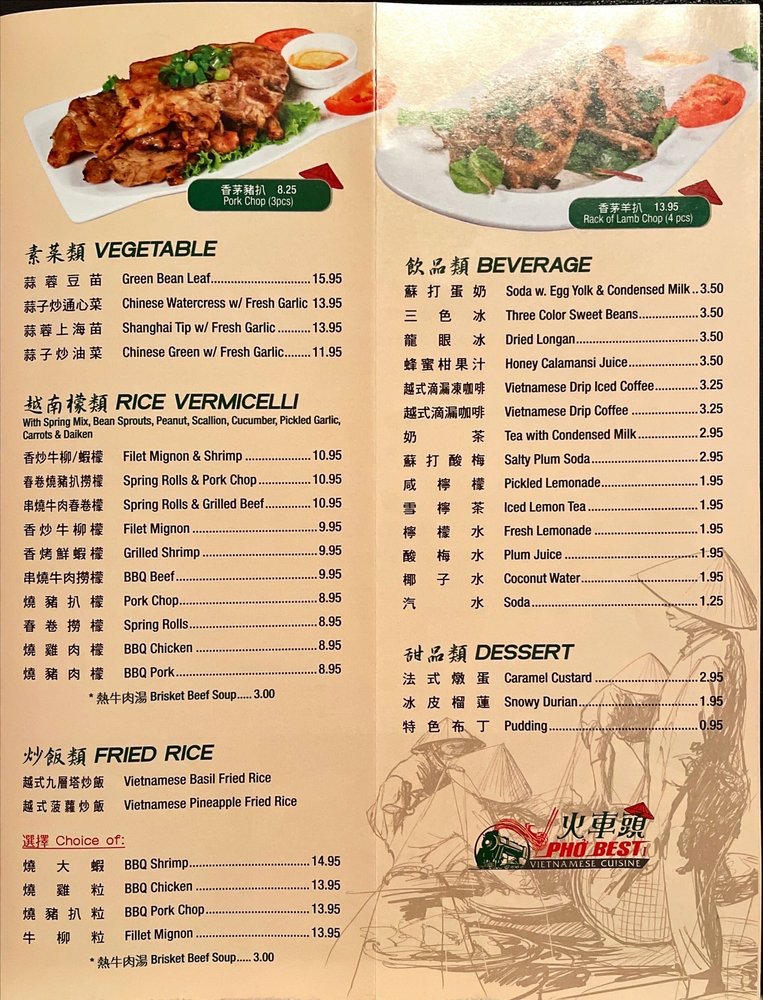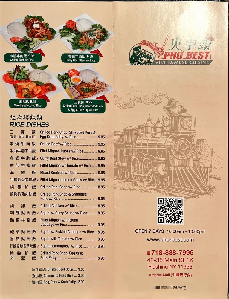 Introducing the menu at Pho Best, a Vietnamese restaurant located in Flushing, NY. This casual dining spot offers a variety of traditional Vietnamese dishes that are sure to satisfy your cravings. From classic pho with generous portions to crispy spring rolls and flavorful grilled pork chop rice, there is something for everyone to enjoy. Customers rave about the affordability and quality of the food, with special mentions of the shrimp summer rolls and fresh ribeye pho. The cozy and clean atmosphere coupled with friendly and attentive service make Pho Best a top choice for Vietnamese cuisine in the area. Whether you're looking for a quick lunch or a relaxing dinner, Pho Best is the perfect spot to indulge in authentic Vietnamese flavors. Experience the best of Vietnamese cuisine at Pho Best today!